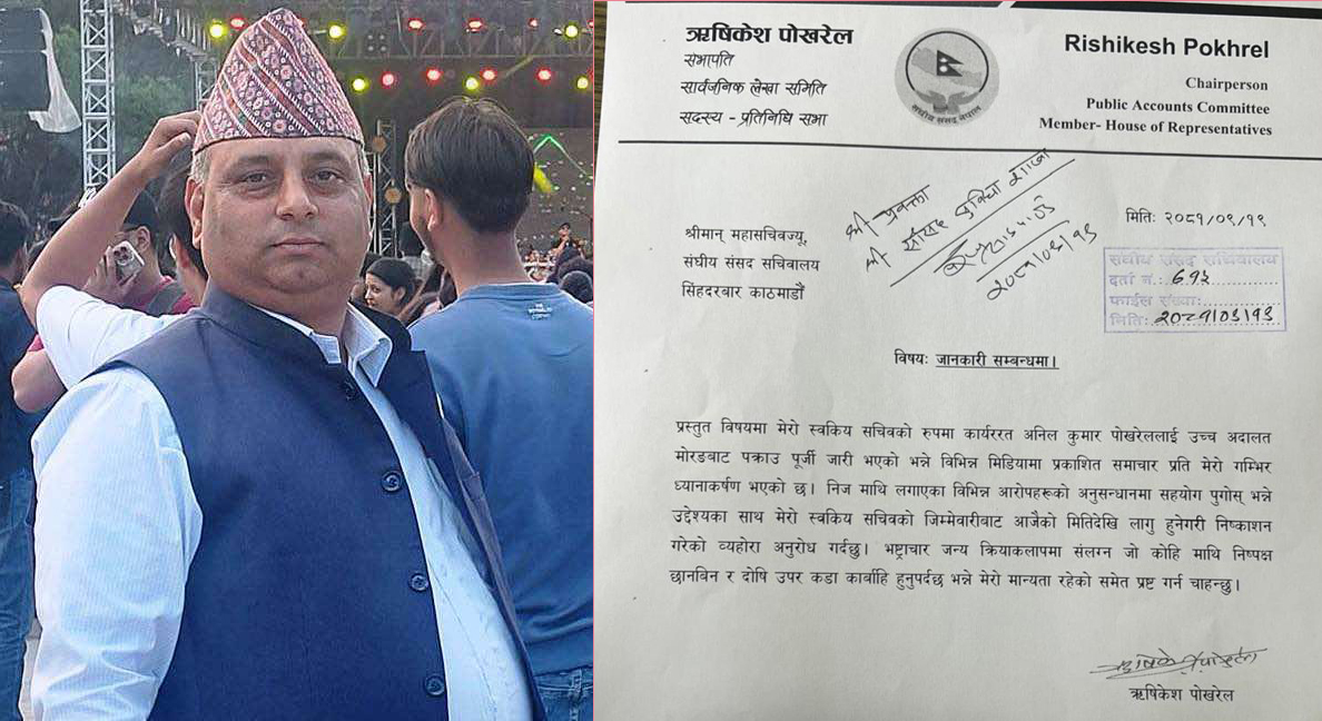आर्थिक अनियमिततामा मुछिएपछि सभापति पोखरेलले स्वकीय सचिव पोखरेललाई जिम्मेवारीबाट हटाएका हुन् । सभापति पोखरेलले सङ्घीय संसद सचिवालयलाई स्वकीय सचिवलाई हटाएको जानकारीसहितको पत्र पठाएका छन् ।