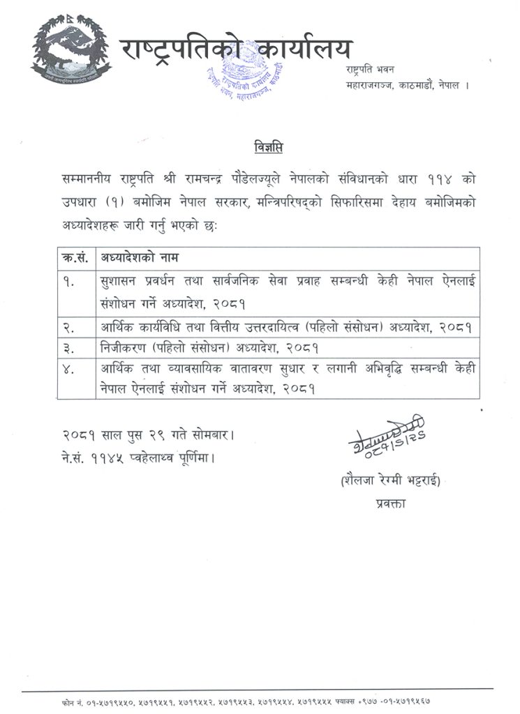 नेपाल कार्यविधि तथा वित्तिय उत्तरदायित्व पहिलो संशोधन अध्यादेश-२०८१,नीजिकरण पहिलो संशोधन अध्यादेश-२०८१,आर्थिक तथा व्यवसायिक वातावरण सुधार, लगानी अभिवृद्धिसम्बन्धी केही नेपाल ऐनलाई संशोधन गर्ने अध्यादेश-२०८१ र सुशासन प्रवर्द्धन तथा सार्वजनिक सेवा प्रवाह सम्बन्धी केही नेपाल ऐनलाई संशोधन गर्ने अध्यादेश–२०८१ जारी भएको राष्ट्रपति कार्यालयद्धारा जारी विज्ञप्तिमा उल्लेख छ ।