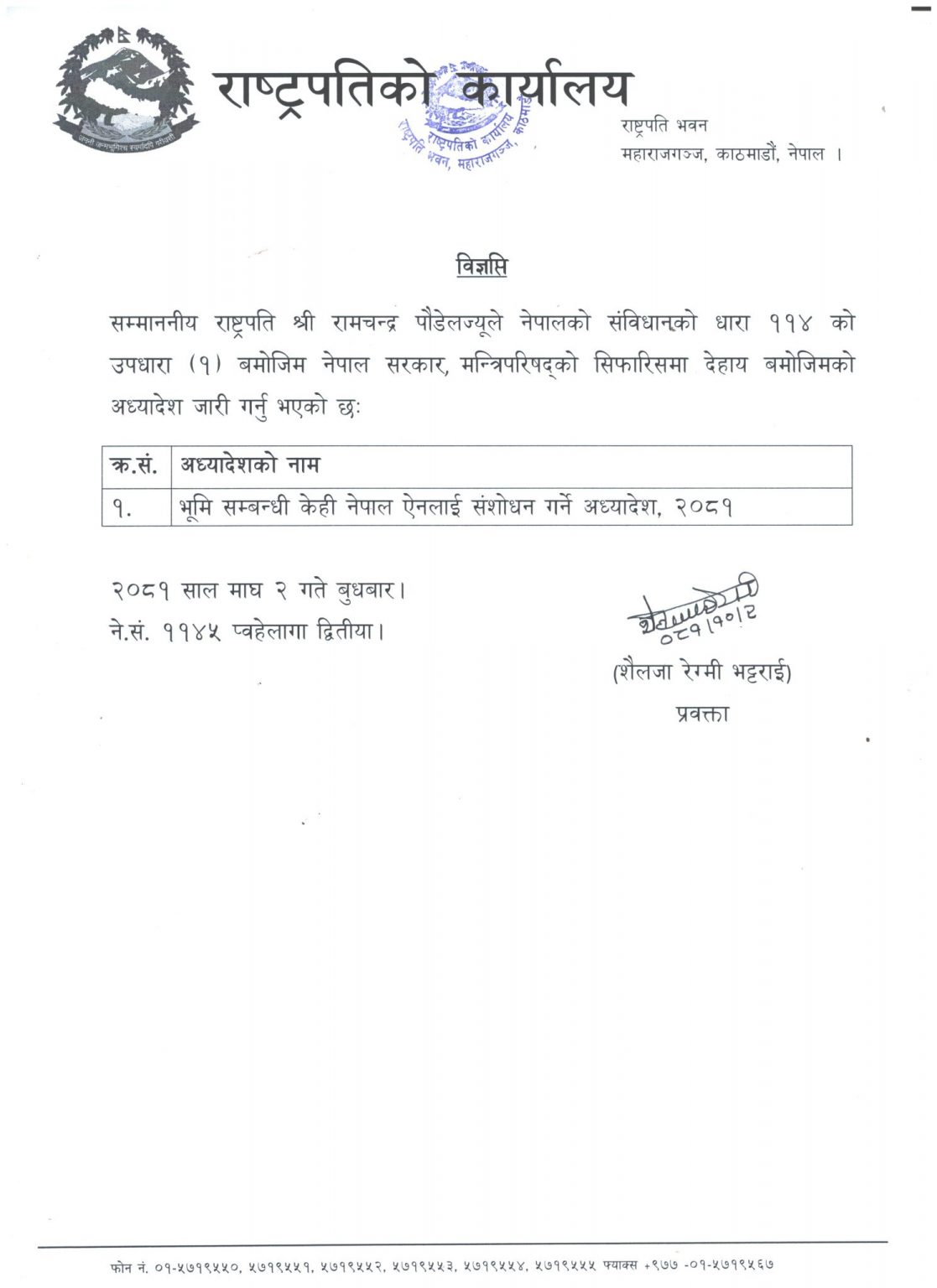 काठमाडौं । राष्ट्रपति रामचन्द्र पौडेलले मन्त्रिपरिषद् बैठकले सिफारिस गरेको भूमि सम्बन्धी केही नेपाल ऐनलाई संशोधन गर्ने अध्यादेश, २०८१ जारी गरेका छन् ।