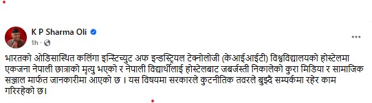 काठमाडौं । प्रधानमन्त्री केपी शर्मा ओलीले भारतको ओडिसास्थित कलिंगा इन्स्टिच्युट अफ इन्डस्ट्रियल टेक्नोलोजी (केआईआईटी) विश्वविद्यालयको होस्टेलमा नेपाली विद्यार्थीको मृत्यु भएको विषयमा सरकारले कुटनीतिक तवरले बुझ्दै सम्पर्कमा रहेर काम गरिरहेको बताएका छन् ।