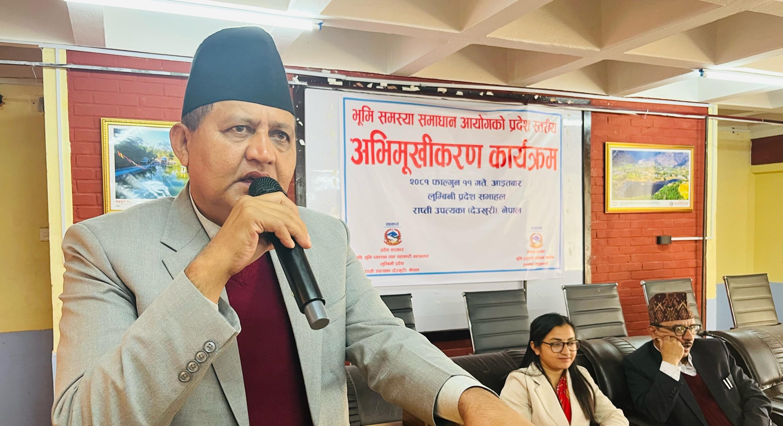 दाङ । लुम्बिनी प्रदेशका मुख्यमन्त्री चेतनारायण आचार्यले भूमि सम्बन्धी समस्या समाधान गर्न प्रदेश सरकारले प्रभावकारी समन्वय र सहजीकरण गर्ने बताएका छन् । भूमि समस्या समाधान आयोगले आयोजना गरेको प्रदेशस्तरीय अभिमुखीकरण कार्यक्रमलाई आइतबार सम्बोधन गर्दै मुख्यमन्त्री आचार्यले भूमिहीन सुकुम्बासी, भूमिहीन दलित र अव्यवस्थित बसोबासीको समस्या समाधानका लागि प्रदेश सरकारले प्रभावकारी सहजीकरण गर्ने उल्लेख गरे।