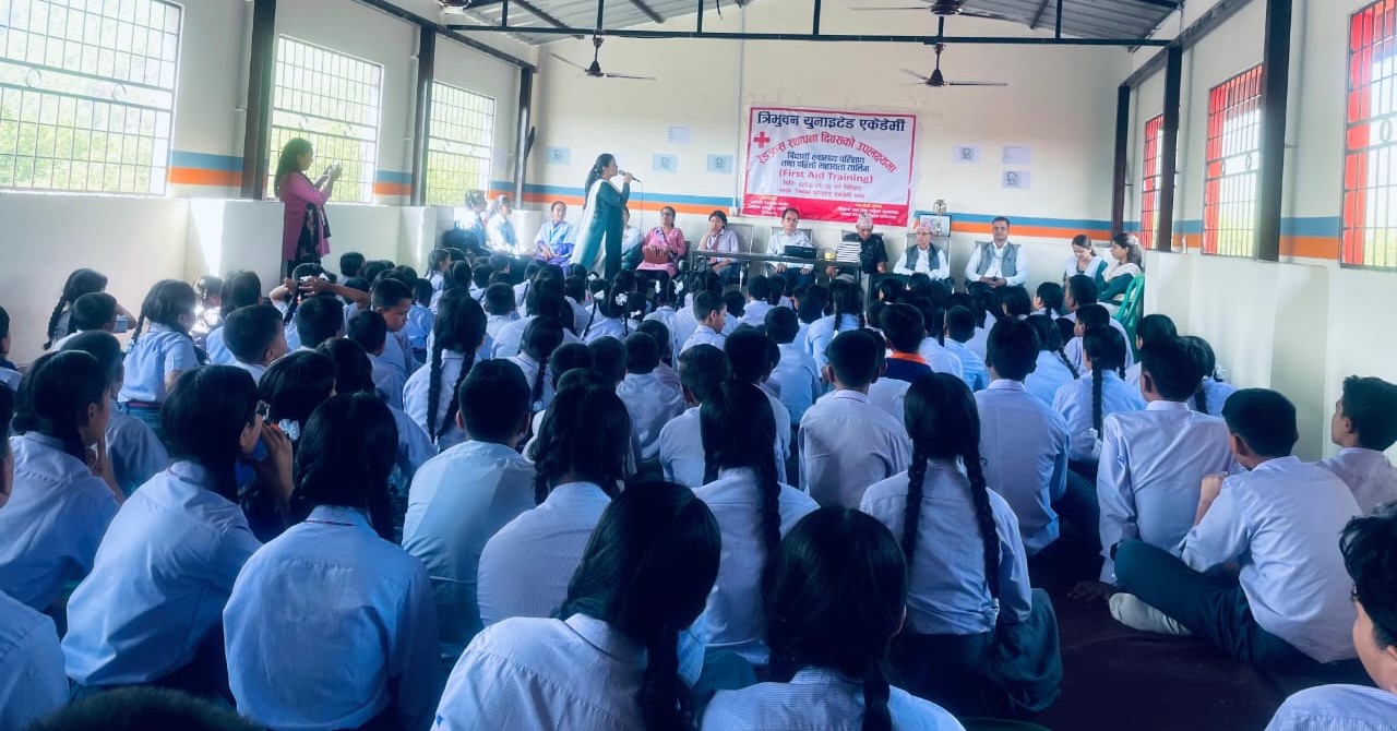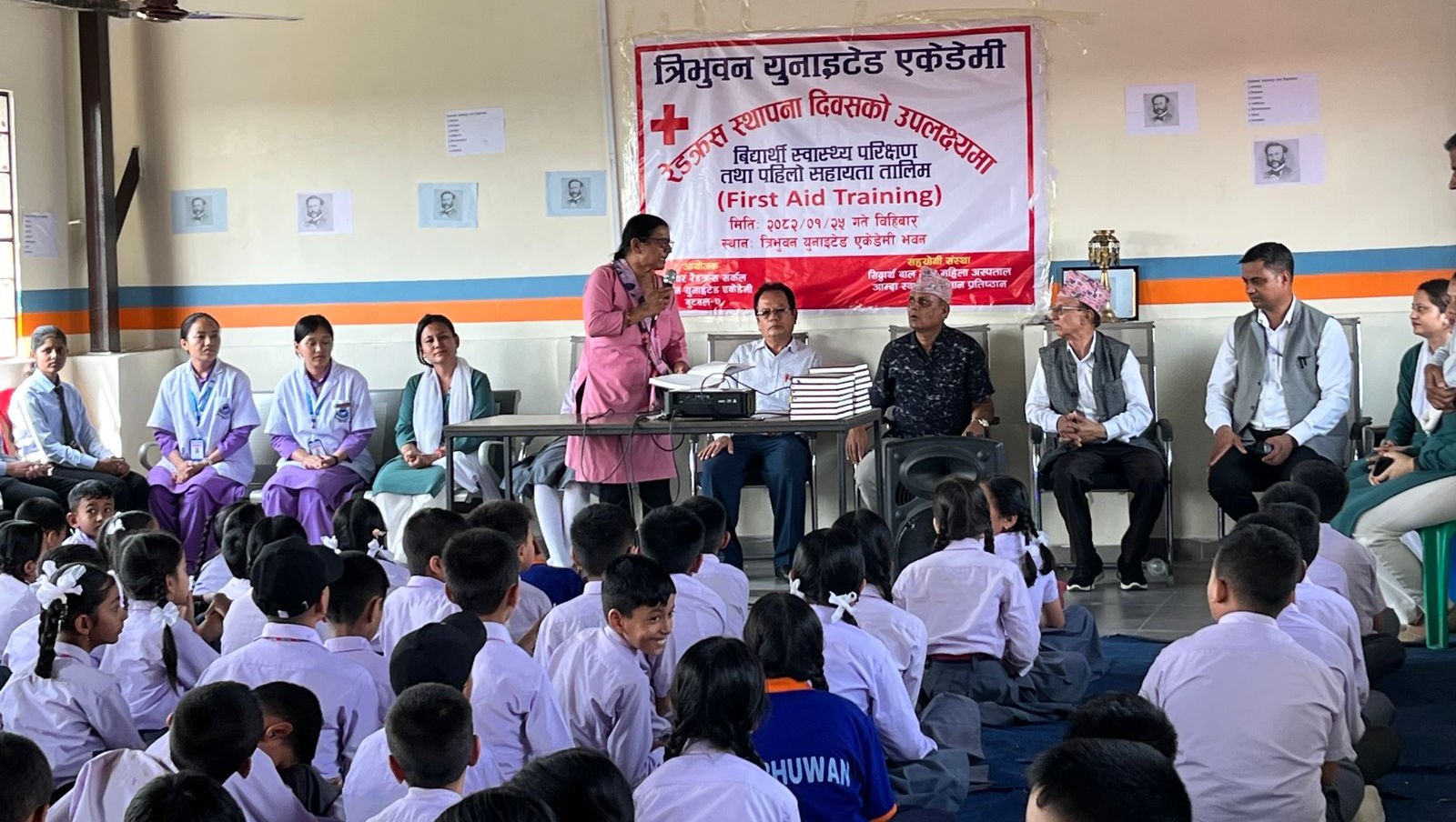 जुनियर रेडक्रस सर्कल त्रिभुवन युनाइटेड एकेडेमीले विद्यालयमा अध्ययनरत कक्षा १ देखि १० सम्मका ५ सय ६० जना विद्यार्थीहरूको स्वास्थ्य परीक्षण गरिनुका साथै कक्षा ३ देखि १० सम्मका ३ सय ४० जना विद्यार्थीहरूलाई प्राथमिक उपचार (फस्ट एड) तालिम दिइएको हो।