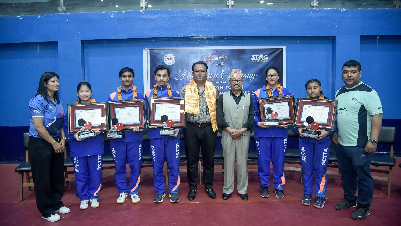 लैनचौरस्थित राष्ट्रिय टेबलटेनिस प्रशिक्षण केन्द्रमा गत वैशाख ११ देखि १४ गतेसम्म भएको प्रतियोगतामा नेपालले एक स्वर्ण, ६ रजत र ५ कांस्यसहित १२ पदक जितेको थियो । स्ट्याग च्याम्पियन्स टेबलटेनिस एकेडेमीले यु–१९ उमेर समूहमा गनञ्जय दाहाल र प्रवेश बस्नेत तथा यु–१५ मा पदक जित्ने शुभश्री श्रेष्ठ, प्राज्ना महर्जन र सुरम्या शाक्यलाई सम्मान गरेको हो ।