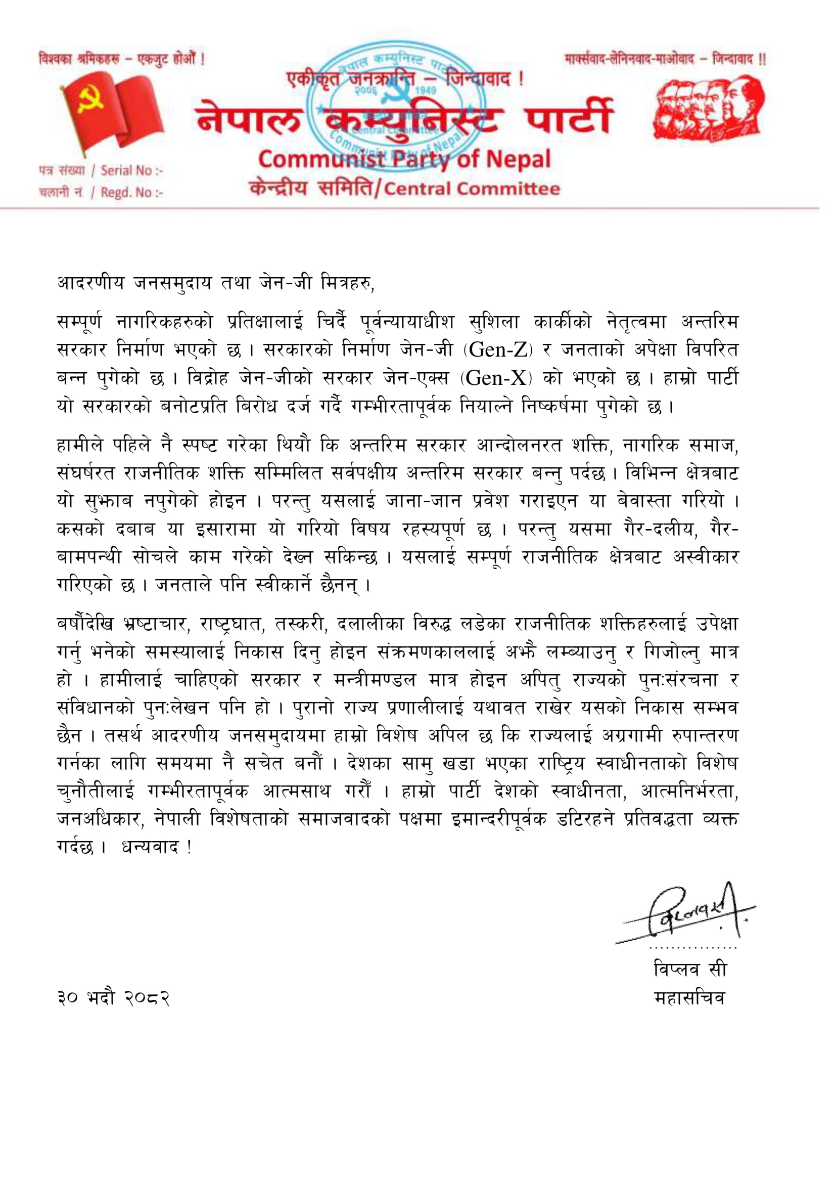 ‘हामीले पहिले नै स्पष्ट गरेका थियौ कि अन्तरिम सरकार आन्दोलनरत शक्ति, नागरिक समाज, संघर्षरत राजनीतिक शक्ति सम्मिलित सर्वपक्षीय अन्तरिम सरकार बन्नु पर्दछ । विभिन्न क्षेत्रबाट यो सुझाब नपुगेको होइन । परन्तु यसलाई जाना–जान प्रवेश गराइएन या बेवास्ता गरियो ।, जेन जीलाई सम्बोधन गर्दै सार्वजनिक विज्ञप्तिमा भनिएको छ, ‘कसको दबाब या इसारामा यो गरियो विषय रहस्यपूर्ण छ । परन्तु यसमा गैर–दलीय, गैर– बामपन्थी सोचले काम गरेको देख्न सकिन्छ । यसलाई सम्पूर्ण राजनीतिक क्षेत्रबाट अस्वीकार गरिएको छ । जनताले पनि स्वीकार्ने छैनन् ।’